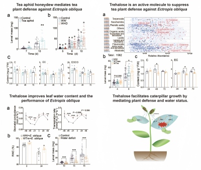 近日,我所茶樹遺傳育種創(chuàng)新團(tuán)隊(duì)在茶樹介導(dǎo)的植食性昆蟲互作機(jī)理解析方面取得重要進(jìn)展,首次鑒定了茶蚜蜜露中的海藻糖是調(diào)控茶蚜-茶樹-茶尺蠖三重互作關(guān)系的關(guān)鍵活性分子...??