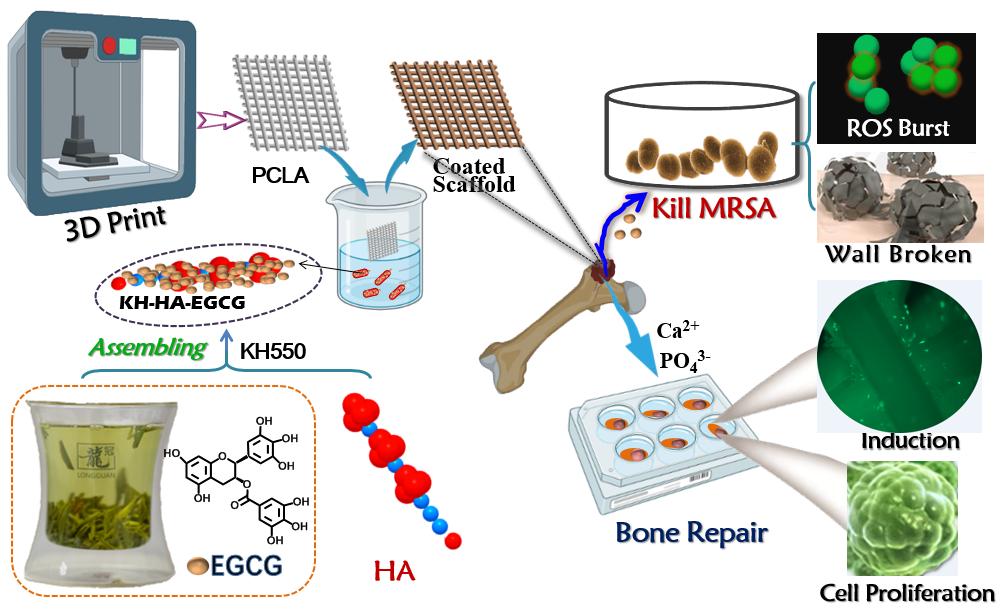 Fig. 1. Schematic diagram of EGCG self-assembled HA coating on 3D printed PCLA scaffold. PCLA/KH-HA-EGCG can effectively promote osteogenic differentiation and in situ inhibit MRSA colonization in bone repair microenvironment.