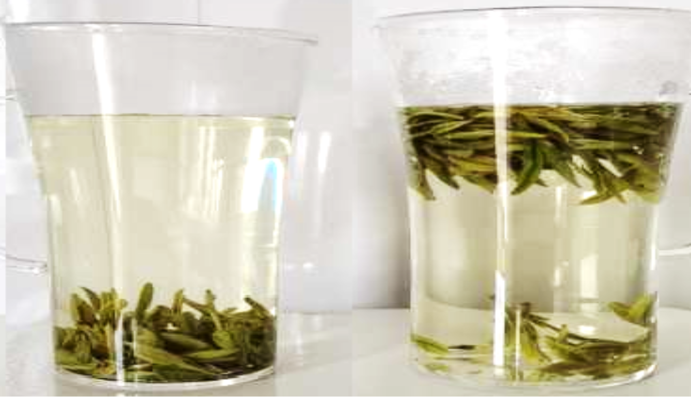 左:本成果所制龍井茶很快下沉右:傳統機制龍井茶很難下沉