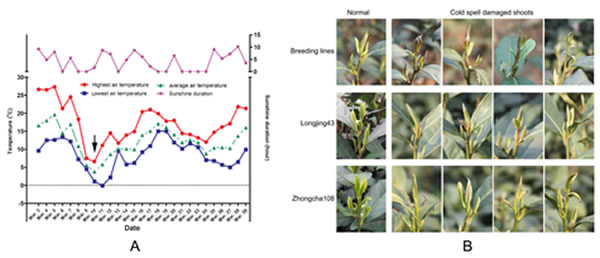 圖1 倒春寒發生過程中的氣象條件變化(A)及茶樹新梢受害表型(B)