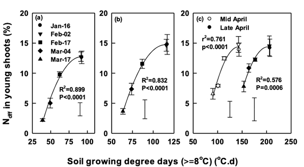 圖1 春茶肥料氮(Ndff)與土壤活動積溫的關系