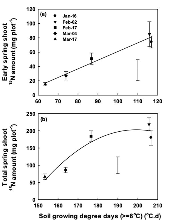圖2 茶葉新梢15N吸收量與土壤活動積溫的關系(a)早期春茶;(b)春茶15N總吸收量