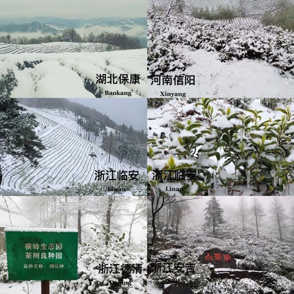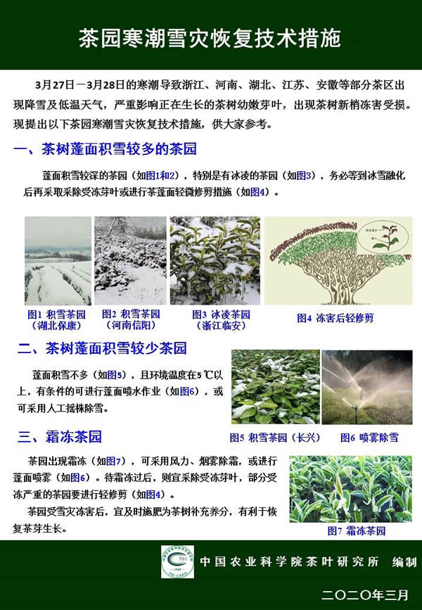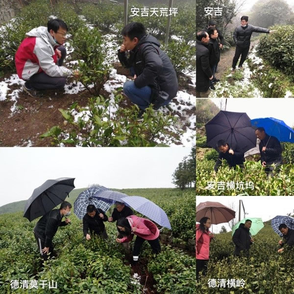 28日上午種植中心有關(guān)專家分頭了解了河南、湖北、江蘇和浙江重點(diǎn)區(qū)域的降雪情況,并就本次寒潮降雪對(duì)春茶生產(chǎn)可能造成的影響及時(shí)進(jìn)行研判,迅速編制了《茶園寒潮雪災(zāi)恢復(fù)技術(shù)措施》掛圖,第一時(shí)間通過中國(guó)茶葉學(xué)會(huì)微信平臺(tái)發(fā)布,截至目前點(diǎn)擊量已破萬次。28日下午和29日,中心分別派出專家到安吉天荒坪和德清橫嶺茶場(chǎng)實(shí)地察看雪情和茶芽受凍情況,指導(dǎo)茶農(nóng)、茶企科學(xué)應(yīng)對(duì)本次寒潮降雪。