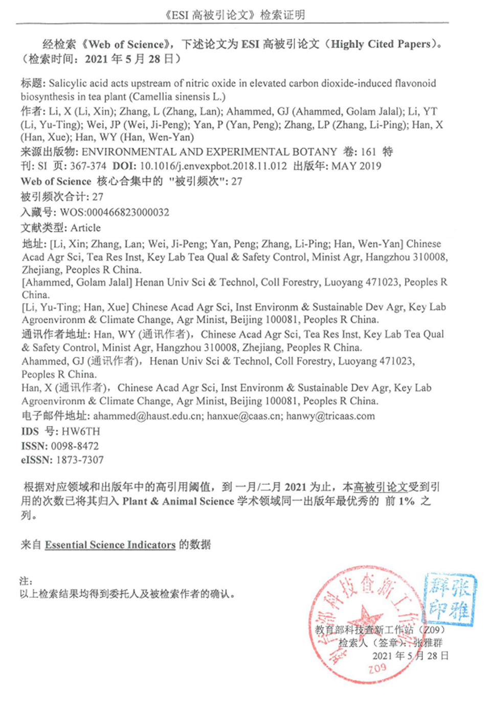 “Salicylic acid acts upstream of nitric oxide in elevated carbon dioxide-induced flavonoid biosynthesis in tea plant(Camellia sinensis L.)”,自2019年在Environmental and Experimental Botany上發(fā)表至今,被引用次數(shù)已達(dá)27次(Web of Science數(shù)據(jù)統(tǒng)計(jì))。韓文炎研究員為該論文的通訊作者。論文揭示了水楊酸和一氧化氮信號(hào)參與了二氧化碳濃度升高環(huán)境下茶樹類黃酮代謝的調(diào)控,為氣候變化環(huán)境下茶樹品質(zhì)代謝調(diào)控提供了理論依據(jù)。