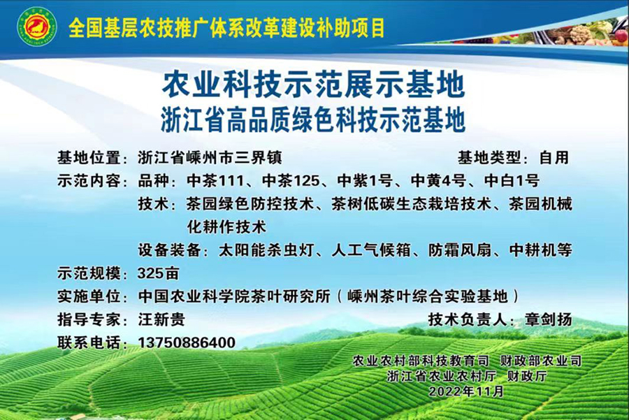 近日,嵊州市農業農村局印發了《關于確定2022年高品質綠色科技示范基地建設單位的通知》,我所嵊州茶葉綜合實驗基地入選。