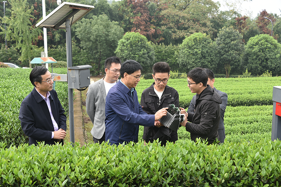 楊振海詳細考察了嵊州茶葉綜合實驗基地建設和運轉情況,實地觀摩了茶樹新品種示范園建設、茶葉機械化采摘裝備、智能化加工生產線等研制情況,并與試驗人員進行了現場交流。