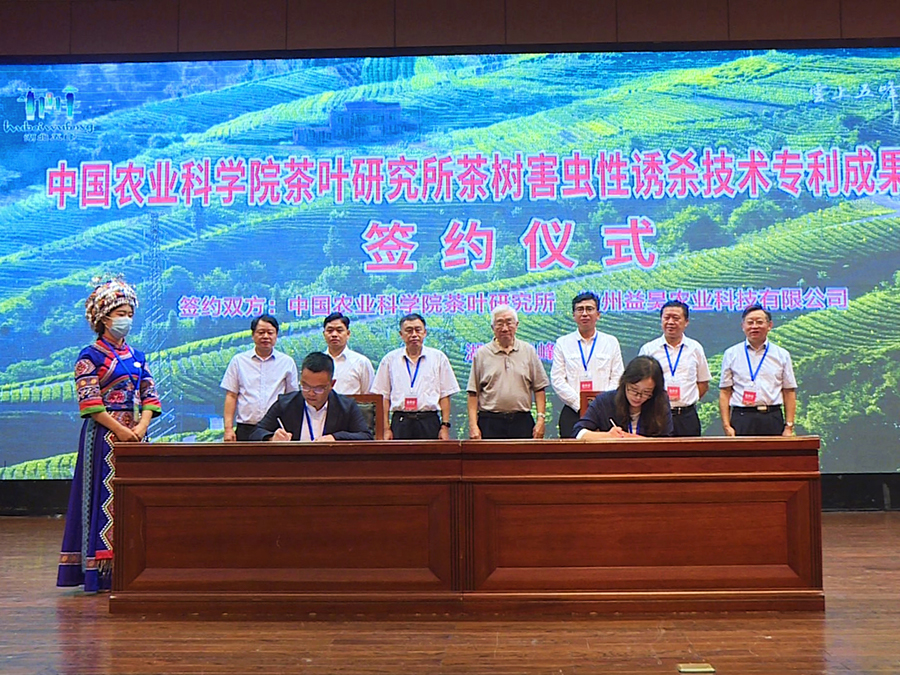 現場觀摩結束后,舉行了專利成果轉化簽約儀式。陳宗懋院士團隊發明的“一種灰茶尺蛾雄蟲性誘劑及含該性誘劑的誘芯制備方法”專利以獨占許可的方式授權杭州益昊農業科技有限公司成果轉化,簽約金額突破一千萬元,是我國茶樹植保領域知識產權創造和運用工作的新突破。