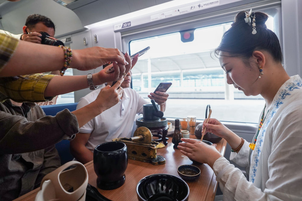 5月20日,南京客運(yùn)段工作人員(右一)在G2807次高鐵列車車廂內(nèi)進(jìn)行茶藝表演。新華社記者 李博 攝