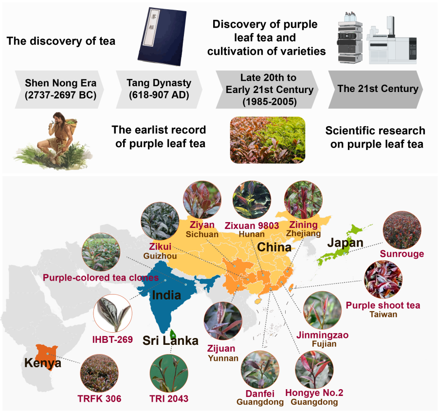 近日,團(tuán)隊(duì)在國(guó)際期刊Comprehensive Reviews in Food Science and Food Safety上發(fā)表了題為“A comprehensive review on the promising purple leaf tea”的綜述論文,系統(tǒng)論述了紫葉茶的化學(xué)成分、加工技術(shù)、健康益處及食品工業(yè)應(yīng)用潛力,為紫葉茶的開(kāi)發(fā)與應(yīng)用提供了參考依據(jù)。此外,還提出了紫葉茶產(chǎn)業(yè)化面臨的一些挑戰(zhàn),指出未來(lái)研究應(yīng)聚焦于優(yōu)化生產(chǎn)工藝、系統(tǒng)評(píng)估健康功能及拓展食品應(yīng)用領(lǐng)域。該論文被遴選為雜志當(dāng)期的封面文章(Featured Cover),封面圖片的設(shè)計(jì)以紫葉茶的自然意象為核心,展現(xiàn)了紫色茶樹(shù)的嫩葉、紫葉茶產(chǎn)品及其提取物等,凸顯了花青素是紫葉茶中重要的品質(zhì)化學(xué)成分。